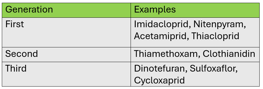 Neonicotinoids are newer insecticides which are less toxic to humans compared to organophosphates. This group of insecticides are neurotoxic and specifically acts on nicotinic Acetylcholine receptors in central nervous system. EPA has classified neonicotinoids as class II and class III toxins. Even though used widely in the field of horticulture, these compounds are found to be toxic to bees.